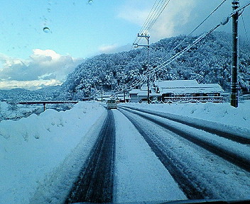 通勤のバスが遅れそうなので、母上に送ってもらってるとこです。